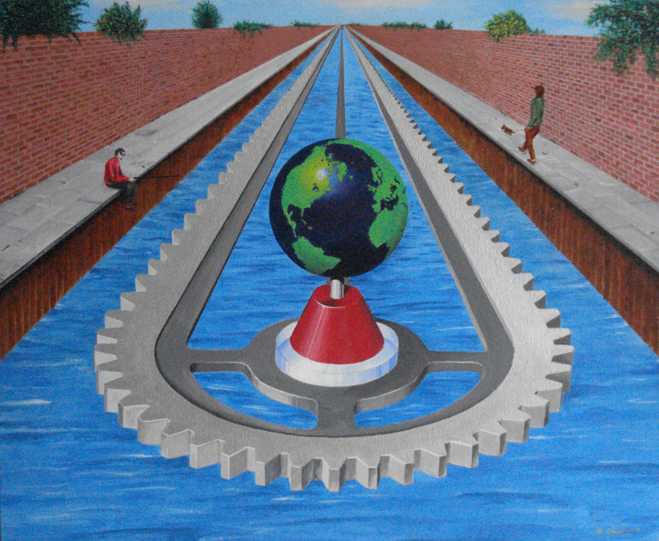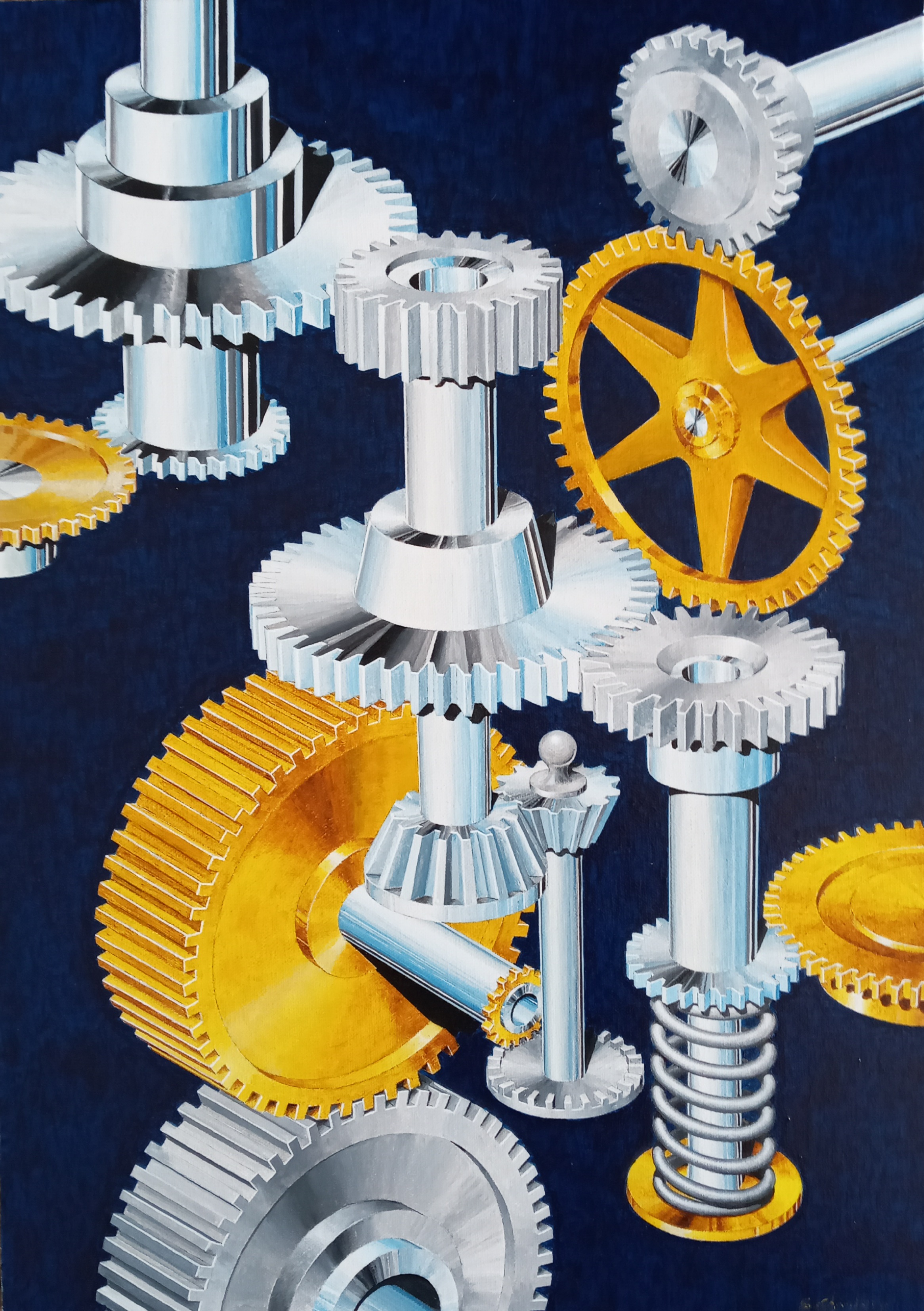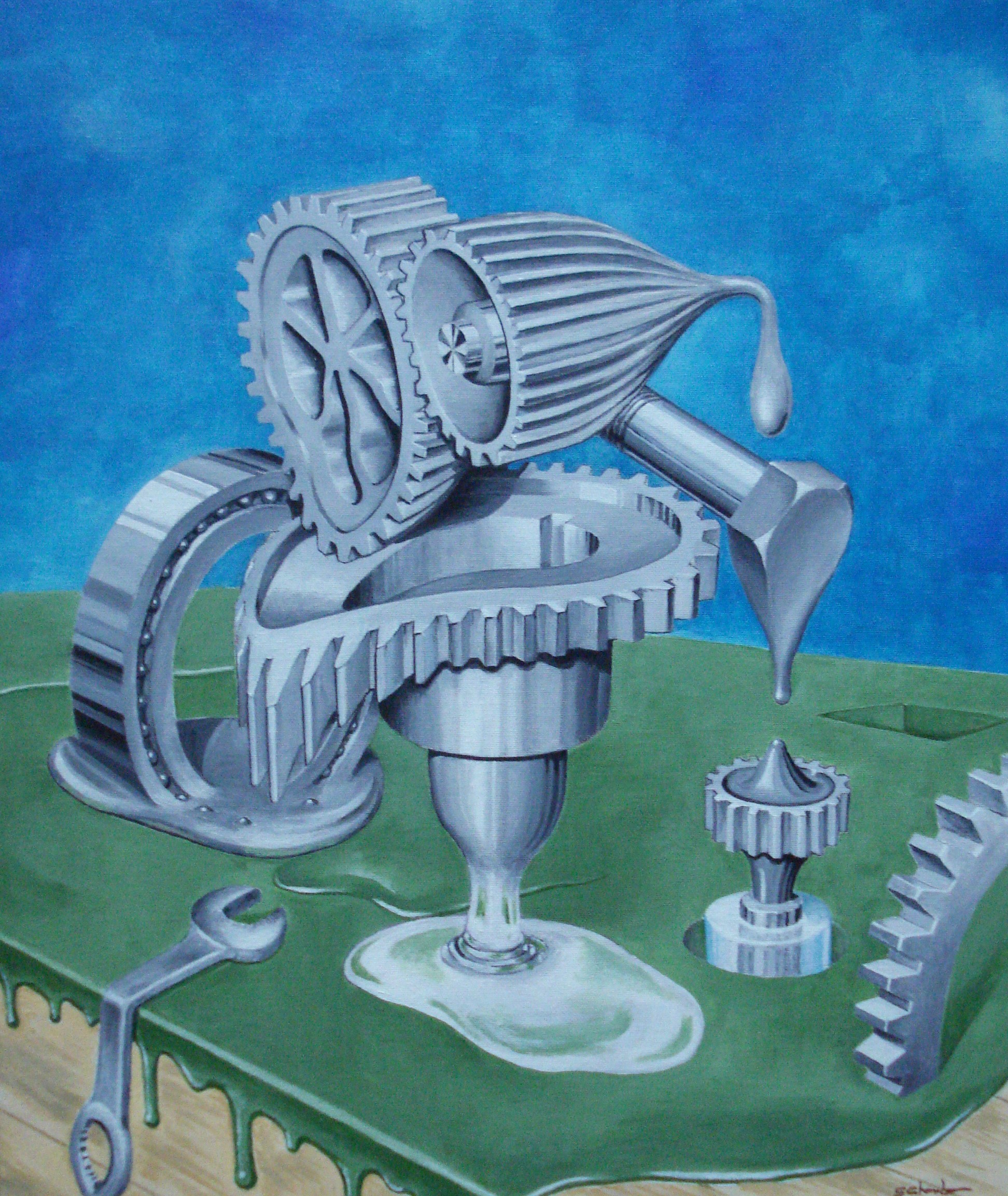 Melting cogs. Acrylic on canvas board. 22″ x 18″ 559 x 457mm