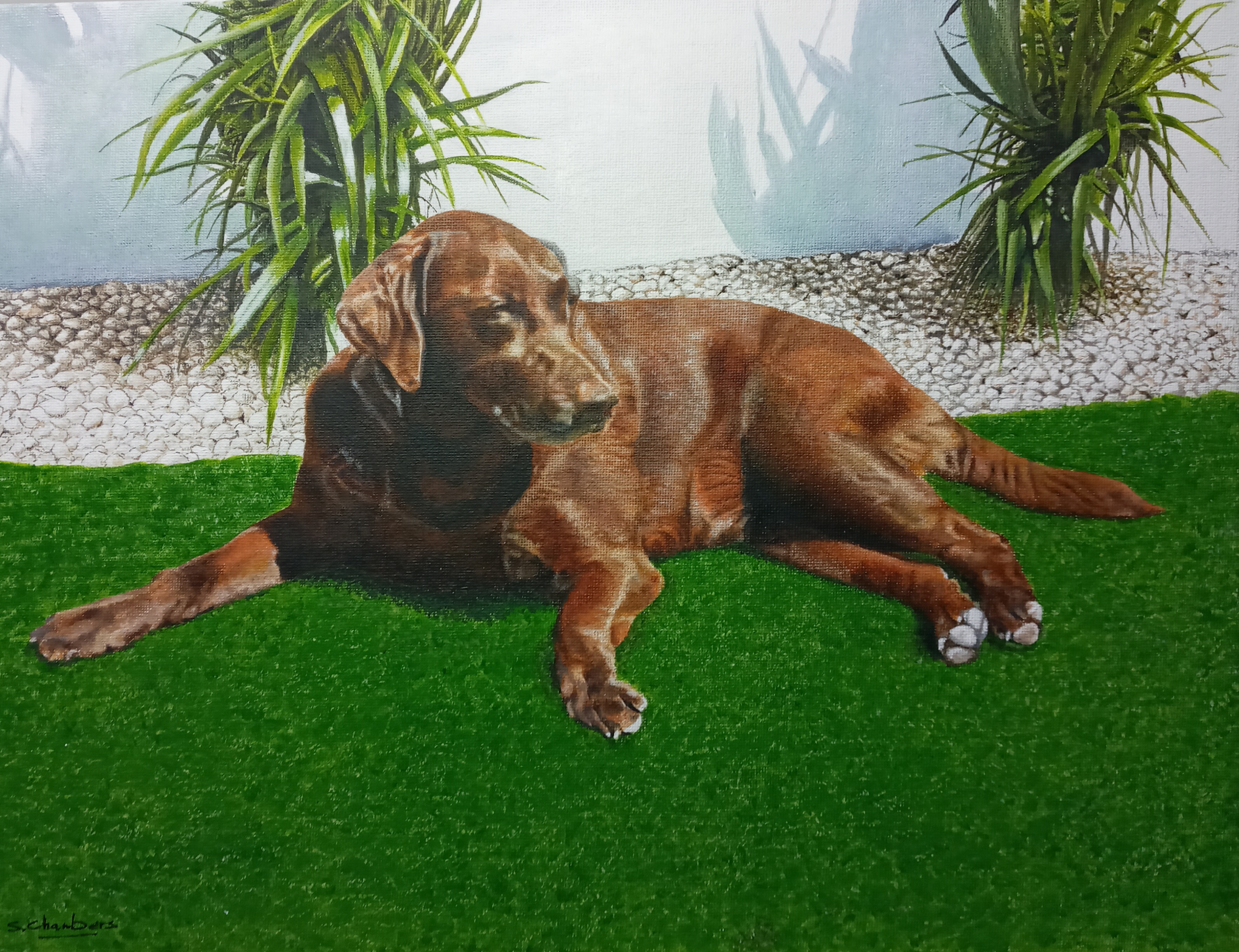 Chocolate Labrador. Acrylic paint on canvas board. 14 x 11ins, 356 x 278mm.